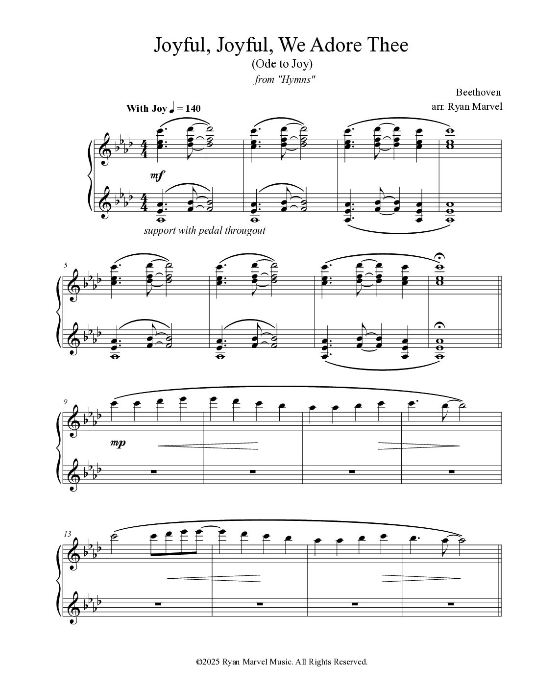 “Joyful, Joyful We Adore Thee” sheet music. Beethoven. Original arrangement by Ryan Marvel. From upcoming collection “Hymns” (November 2025)
