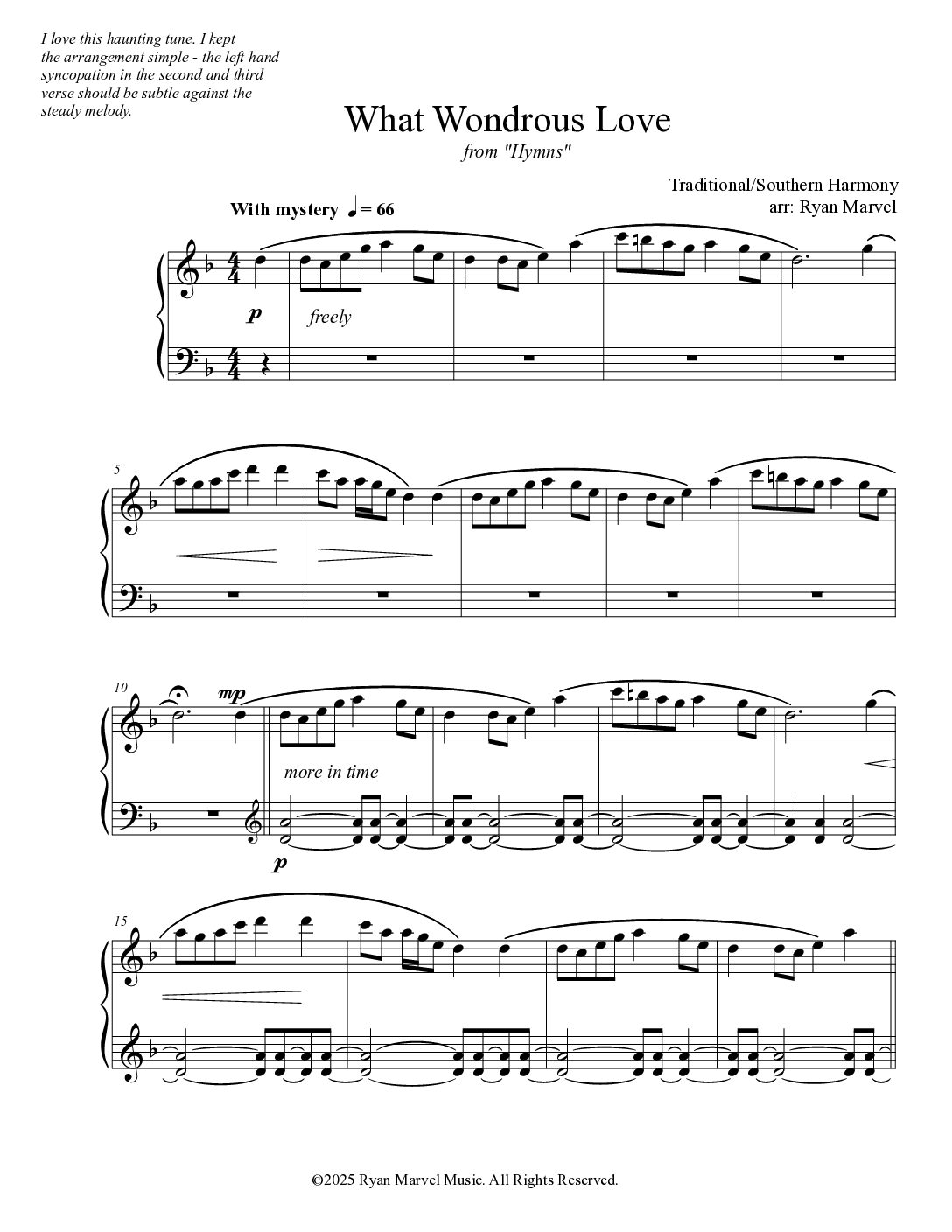 “What Wondrous Love” sheet music.  Welker/Southern Harmony. Original arrangement by Ryan Marvel.   From upcoming collection “Hymns” (November 2025)